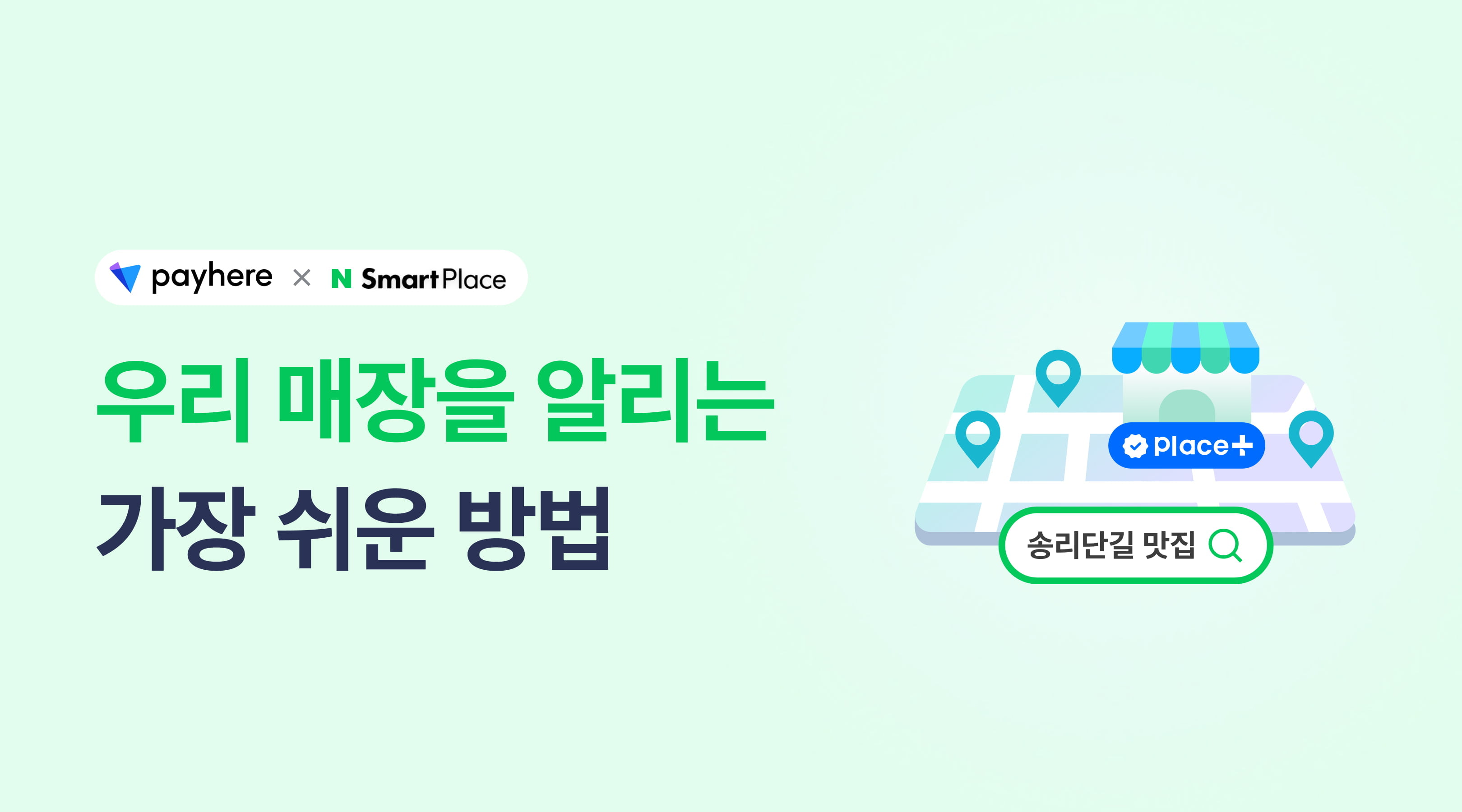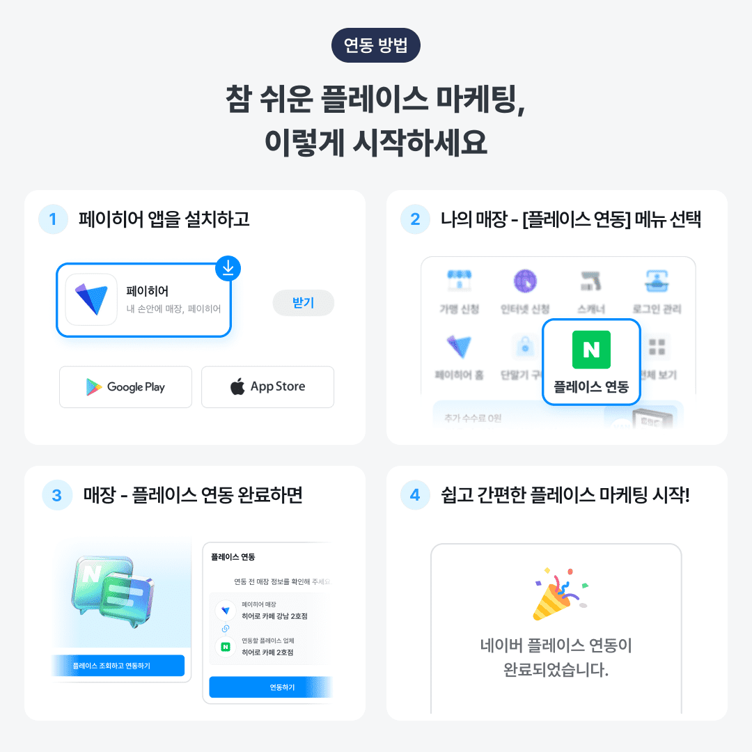 플레이스 연동은 스토어 - [페이히어 앱] 다운로드 후, 무료로 연동할 수 있어요.