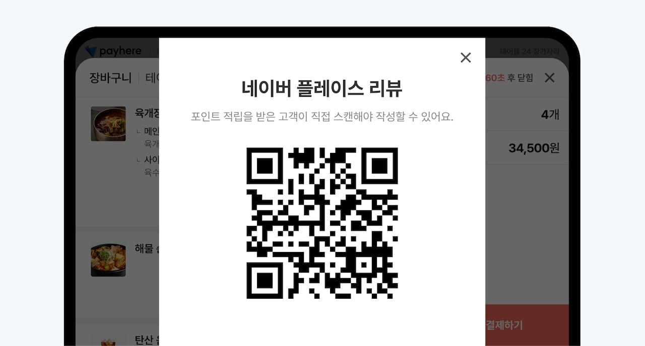 2. 테이블오더 화면에 자동으로 리뷰 작성을 유도하는 QR 코드가 떠요