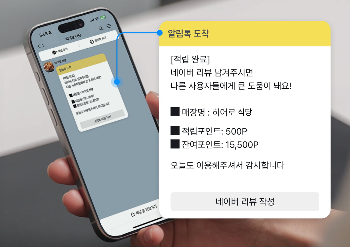 혹시 손님이 QR 스캔도 귀찮아하거나 창을 닫아버리면 어떡하냐고요? 걱정하지 않으셔도 됩니다. 포스 또는 테이블오더 어디에서 결제하든, 적립만 했다면 손님 휴대폰으로 알림톡이 자동 발송 되기 때문이죠. 배달앱처럼 자동으로 리뷰 알림이 가는 과정과 동일해요.